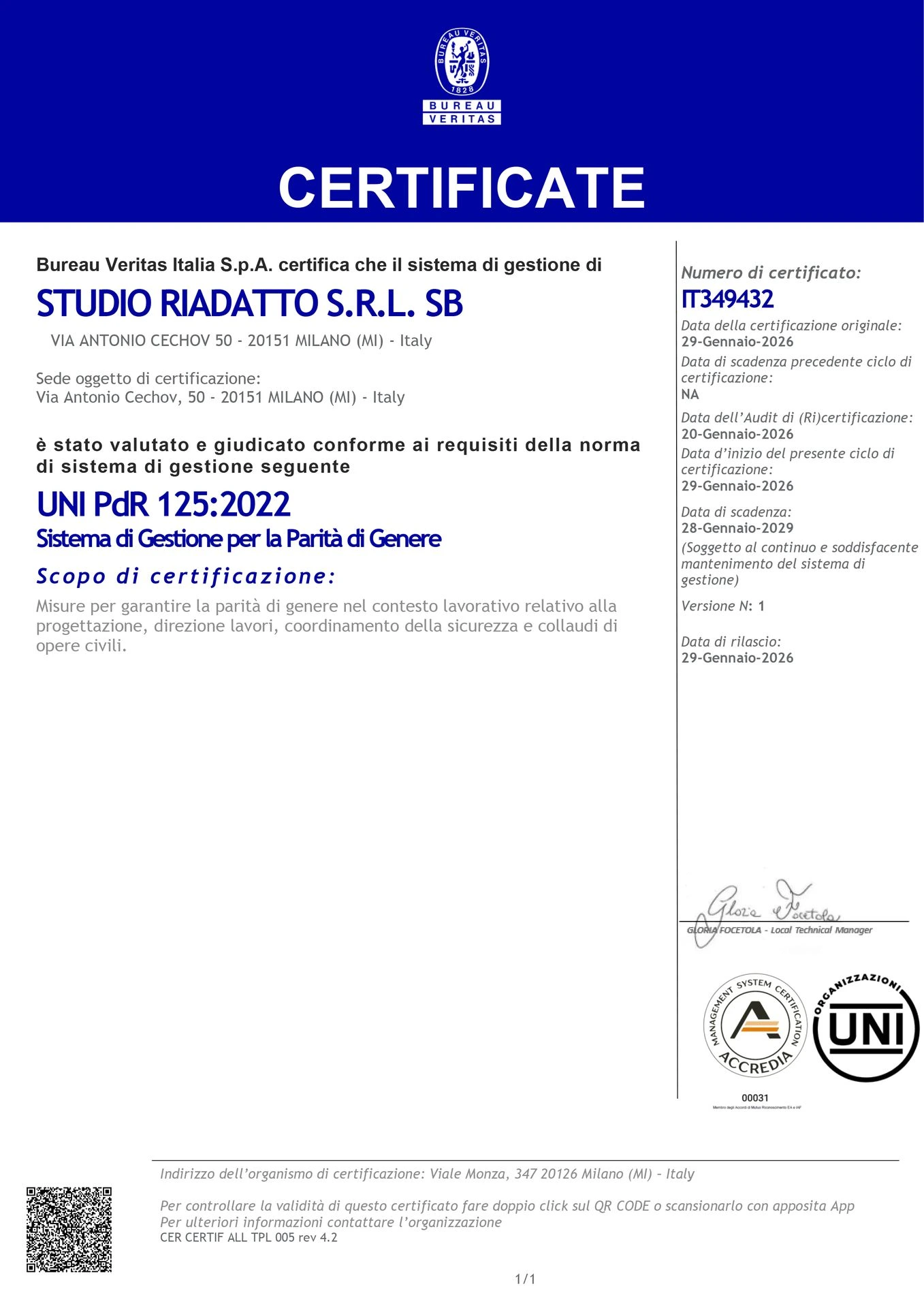 Studio RiADATTO S.r.l. Società Benefit ha ottenuto la Certificazione per la Parità di Genere UNI PdR 125:2022, rilasciata da Bureau Veritas Italia, un riconoscimento che attesta l’impegno concreto dello studio nella promozione di un ambiente di lavoro equo, inclusivo e rispettoso delle pari opportunità.